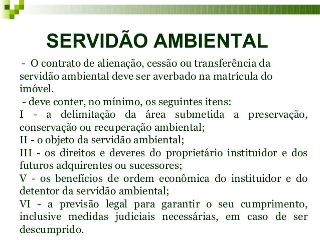 24. 24. SERVIDÃO AMBIENTAL - O contrato de alienação, cessão ou transferência da servidão ambiental deve ser averbado na matrícula do imóvel. - deve conter, no mínimo, os seguintes itens: I - a delimitação da área submetida a preservação, conservação ou recuperação ambiental; II - o objeto da servidão ambiental; III - os direitos e deveres do proprietário instituidor e dos futuros adquirentes ou sucessores; V - os benefícios de ordem econômica do instituidor e do detentor da servidão ambiental; VI - a previsão legal para garantir o seu cumprimento, inclusive medidas judiciais necessárias, em caso de ser descumprido.