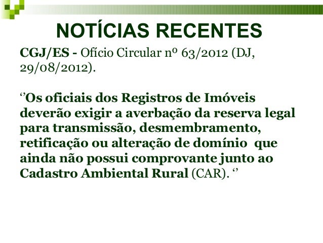 3. 3. NOTÍCIAS RECENTES CGJ/ES - Ofício Circular nº 63/2012 (DJ, 29/08/2012). ‘’Os oficiais dos Registros de Imóveis deverão exigir a averbação da reserva legal para transmissão, desmembramento, retificação ou alteração de domínio que ainda não possui comprovante junto ao Cadastro Ambiental Rural (CAR). ‘’