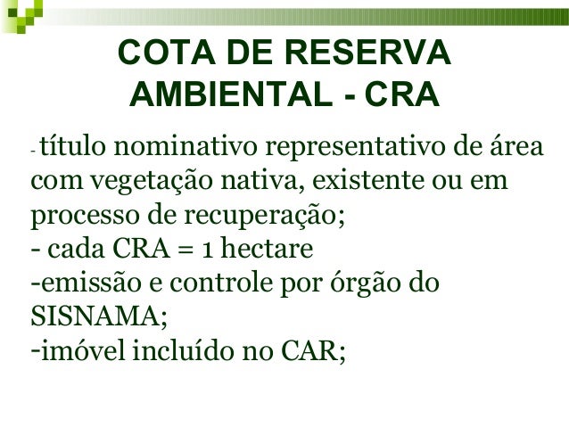 25. 25. COTA DE RESERVA AMBIENTAL - CRA - título nominativo representativo de área com vegetação nativa, existente ou em processo de recuperação; - cada CRA = 1 hectare -emissão e controle por órgão do SISNAMA; -imóvel incluído no CAR;
