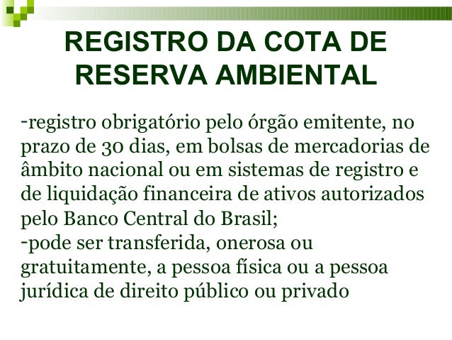 26. 26. REGISTRO DA COTA DE RESERVA AMBIENTAL -registro obrigatório pelo órgão emitente, no prazo de 30 dias, em bolsas de mercadorias de âmbito nacional ou em sistemas de registro e de liquidação financeira de ativos autorizados pelo Banco Central do Brasil; -pode ser transferida, onerosa ou gratuitamente, a pessoa física ou a pessoa jurídica de direito público ou privado