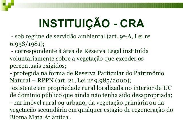 27. 27. INSTITUIÇÃO - CRA - sob regime de servidão ambiental (art. 9o -A, Lei no 6.938/1981); - correspondente à área de Reserva Legal instituída voluntariamente sobre a vegetação que exceder os percentuais exigidos; - protegida na forma de Reserva Particular do Patrimônio Natural – RPPN (art. 21, Lei no 9.985/2000); -existente em propriedade rural localizada no interior de UC de domínio público que ainda não tenha sido desapropriada; - em imóvel rural ou urbano, da vegetação primária ou da vegetação secundária em qualquer estágio de regeneração do Bioma Mata Atlântica .