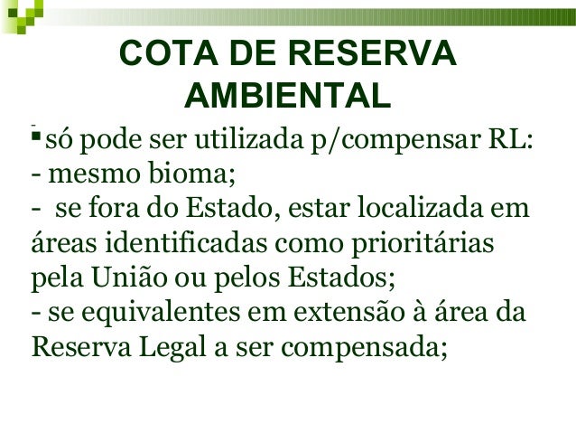 28. 28. COTA DE RESERVA AMBIENTAL -  só pode ser utilizada p/compensar RL: - mesmo bioma; - se fora do Estado, estar localizada em áreas identificadas como prioritárias pela União ou pelos Estados; - se equivalentes em extensão à área da Reserva Legal a ser compensada;