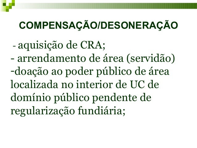 29. 29. COMPENSAÇÃO/DESONERAÇÃO - aquisição de CRA; - arrendamento de área (servidão) -doação ao poder público de área localizada no interior de UC de domínio público pendente de regularização fundiária;