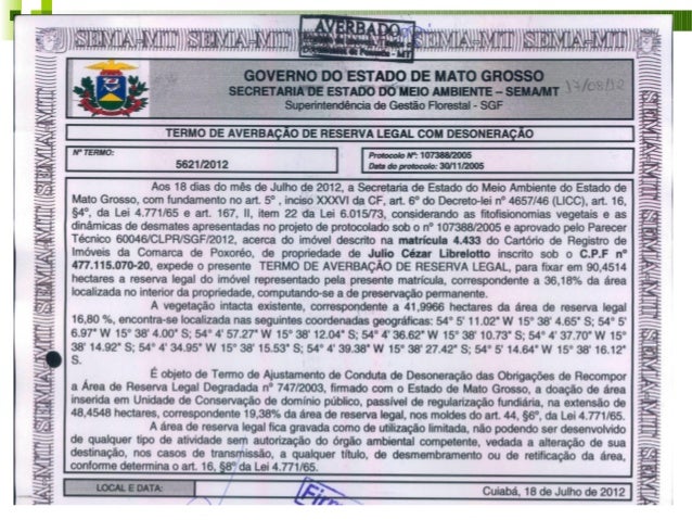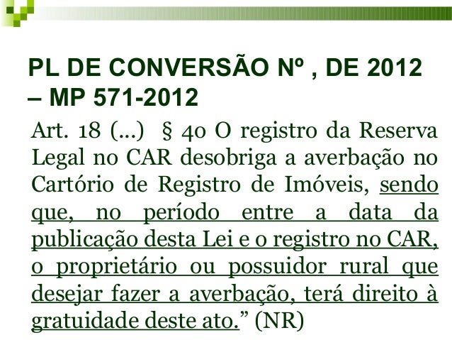 30. 30. PL DE CONVERSÃO Nº , DE 2012 – MP 571-2012 Art. 18 (...) § 4o O registro da Reserva Legal no CAR desobriga a averbação no Cartório de Registro de Imóveis, sendo que, no período entre a data da publicação desta Lei e o registro no CAR, o proprietário ou possuidor rural que desejar fazer a averbação, terá direito à gratuidade deste ato.” (NR)