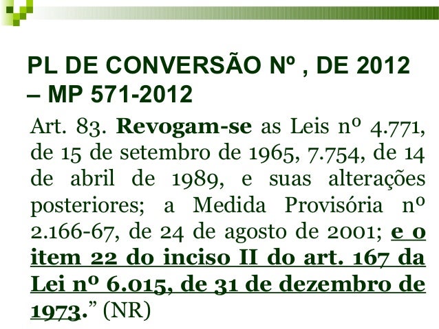 31. 31. PL DE CONVERSÃO Nº , DE 2012 – MP 571-2012 Art. 83. Revogam-se as Leis nº 4.771, de 15 de setembro de 1965, 7.754, de 14 de abril de 1989, e suas alterações posteriores; a Medida Provisória nº 2.166-67, de 24 de agosto de 2001; e o item 22 do inciso II do art. 167 da Lei nº 6.015, de 31 de dezembro de 1973.” (NR)