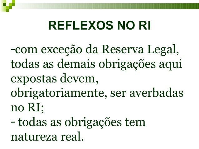 32. 32. REFLEXOS NO RI -com exceção da Reserva Legal, todas as demais obrigações aqui expostas devem, obrigatoriamente, ser averbadas no RI; - todas as obrigações tem natureza real.