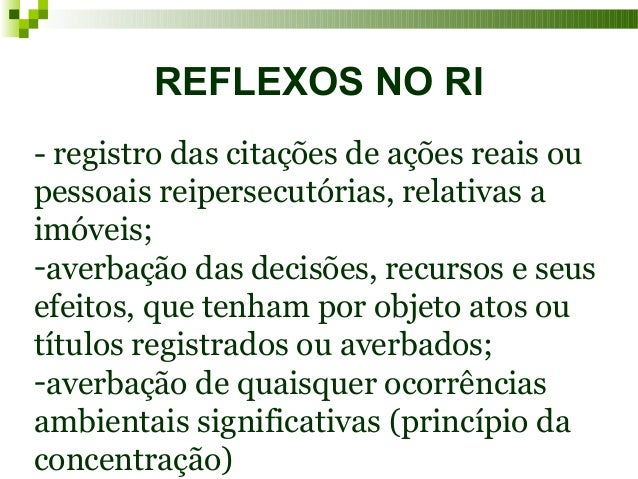 33. 33. REFLEXOS NO RI - registro das citações de ações reais ou pessoais reipersecutórias, relativas a imóveis; -averbação das decisões, recursos e seus efeitos, que tenham por objeto atos ou títulos registrados ou averbados; -averbação de quaisquer ocorrências ambientais significativas (princípio da concentração)