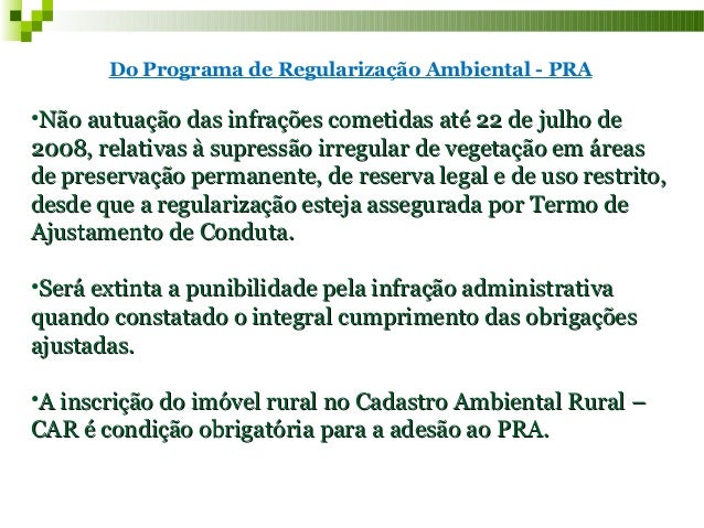 35. 35. Do Programa de Regularização Ambiental - PRA •Não autuação das infrações cometidas até 22 de julho deNão autuação das infrações cometidas até 22 de julho de 2008, relativas à supressão irregular de vegetação em áreas2008, relativas à supressão irregular de vegetação em áreas de preservação permanente, de reserva legal e de uso restrito,de preservação permanente, de reserva legal e de uso restrito, desde que a regularização esteja assegurada por Termo dedesde que a regularização esteja assegurada por Termo de Ajustamento de Conduta.Ajustamento de Conduta. •Será extinta a punibilidade pela infração administrativaSerá extinta a punibilidade pela infração administrativa quando constatado o integral cumprimento das obrigaçõesquando constatado o integral cumprimento das obrigações ajustadas.ajustadas. •A inscrição do imóvel rural no Cadastro Ambiental Rural –A inscrição do imóvel rural no Cadastro Ambiental Rural – CAR é condição obrigatória para a adesão ao PRA.CAR é condição obrigatória para a adesão ao PRA.