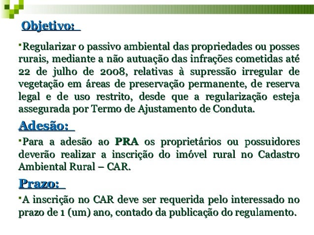36. 36. Objetivo:Objetivo: Regularizar o passivo ambiental das propriedades ou possesRegularizar o passivo ambiental das propriedades ou posses rurais, mediante a não autuação das infrações cometidas atérurais, mediante a não autuação das infrações cometidas até 22 de julho de 2008, relativas à supressão irregular de22 de julho de 2008, relativas à supressão irregular de vegetação em áreas de preservação permanente, de reservavegetação em áreas de preservação permanente, de reserva legal e de uso restrito, desde que a regularização estejalegal e de uso restrito, desde que a regularização esteja assegurada por Termo de Ajustamento de Conduta.assegurada por Termo de Ajustamento de Conduta. Adesão:Adesão: Para a adesão aoPara a adesão ao PRAPRA os proprietários ou possuidoresos proprietários ou possuidores deverão realizar a inscrição do imóvel rural no Cadastrodeverão realizar a inscrição do imóvel rural no Cadastro Ambiental Rural – CAR.Ambiental Rural – CAR. Prazo:Prazo: A inscrição no CAR deve ser requerida pelo interessado noA inscrição no CAR deve ser requerida pelo interessado no prazo de 1 (um) ano, contado da publicação do regulamento.prazo de 1 (um) ano, contado da publicação do regulamento.