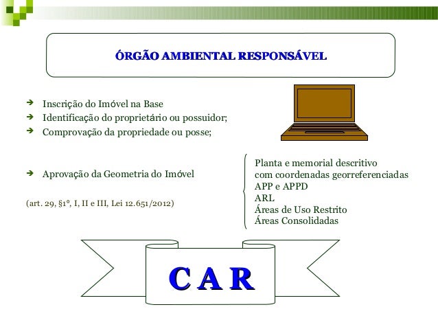 38. 38.  Inscrição do Imóvel na Base  Identificação do proprietário ou possuidor;  Comprovação da propriedade ou posse;  Aprovação da Geometria do Imóvel (art. 29, §1º, I, II e III, Lei 12.651/2012) C A RC A R Planta e memorial descritivo com coordenadas georreferenciadas APP e APPD ARL Áreas de Uso Restrito Áreas Consolidadas ÓRGÃO AMBIENTAL RESPONSÁVELÓRGÃO AMBIENTAL RESPONSÁVEL