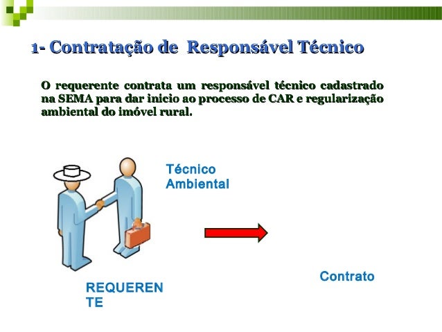 39. 39. O requerente contrata um responsável técnico cadastradoO requerente contrata um responsável técnico cadastrado na SEMA para dar inicio ao processo de CAR e regularizaçãona SEMA para dar inicio ao processo de CAR e regularização ambiental do imóvel rural.ambiental do imóvel rural. 1- Contratação de Responsável Técnico1- Contratação de Responsável Técnico Contrato REQUEREN TE Técnico Ambiental