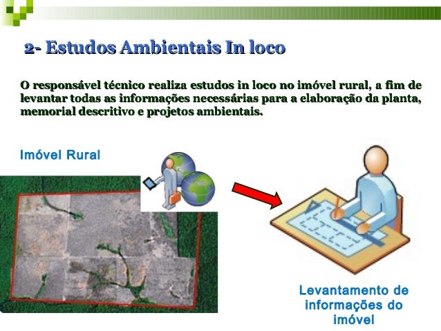 40. 40. O responsável técnico realiza estudos in loco no imóvel rural, a fim deO responsável técnico realiza estudos in loco no imóvel rural, a fim de levantar todas as informações necessárias para a elaboração da planta,levantar todas as informações necessárias para a elaboração da planta, memorial descritivo e projetos ambientais.memorial descritivo e projetos ambientais. 2- Estudos Ambientais In loco2- Estudos Ambientais In loco Imóvel Rural Levantamento de informações do imóvel