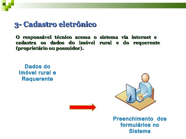 41. 41. O responsável técnico acessa o sistema via internet eO responsável técnico acessa o sistema via internet e cadastra os dados do imóvel rural e do requerentecadastra os dados do imóvel rural e do requerente (proprietário ou possuidor).(proprietário ou possuidor). 3- Cadastro eletrônico3- Cadastro eletrônico Dados do Imóvel rural e Requerente Preenchimento dos formulários no Sistema