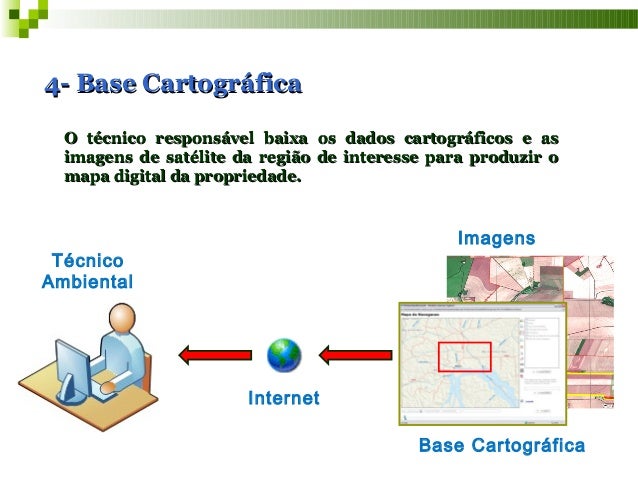 42. 42. O técnico responsável baixa os dados cartográficos e asO técnico responsável baixa os dados cartográficos e as imagens de satélite da região de interesse para produzir oimagens de satélite da região de interesse para produzir o mapa digital da propriedade.mapa digital da propriedade. 4- Base Cartográfica4- Base Cartográfica Técnico Ambiental Internet Imagens Base Cartográfica