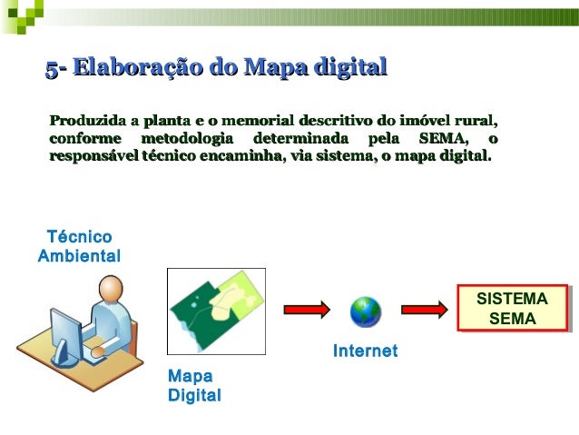 43. 43. Produzida a planta e o memorial descritivo do imóvel rural,Produzida a planta e o memorial descritivo do imóvel rural, conforme metodologia determinada pela SEMA, oconforme metodologia determinada pela SEMA, o responsável técnico encaminha, via sistema, o mapa digital.responsável técnico encaminha, via sistema, o mapa digital. 5- Elaboração do Mapa digital5- Elaboração do Mapa digital Técnico Ambiental Internet SISTEMA SEMA SISTEMA SEMA Mapa Digital