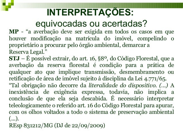 5. 5. INTERPRETAÇÕES: equivocadas ou acertadas? MP - “a averbação deve ser exigida em todos os casos em que houver modificação na matrícula do imóvel, compelindo o proprietário a procurar pelo órgão ambiental, demarcar a Reserva Legal.” STJ – É possível extrair, do art. 16, §8º, do Código Florestal, que a averbação da reserva florestal é condição para a prática de qualquer ato que implique transmissão, desmembramento ou retificação de área de imóvel sujeito à disciplina da Lei 4.771/65. “Tal obrigação não decorre da literalidade do dispositivo. (...) A inexistência de exigência expressa, todavia, não implica a conclusão de que ela seja descabida. É necessário interpretar teleologicamente o referido art. 16 do Código Florestal para apurar, com os olhos voltados a todo o sistema de preservação ambiental (...). REsp 831212/MG (DJ de 22/09/2009)