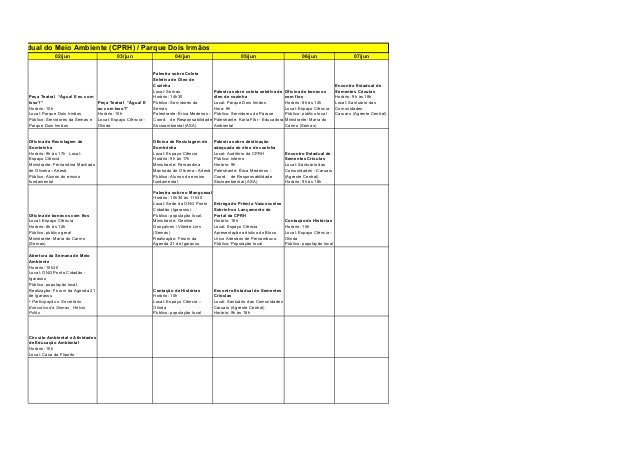 1. 1. DIA 19/05 20/mai 21/mai 22/mai 23/mai 26/mai 27/mai 28/mai 29/mai 30/mai Inauguração do ciclo de Capacitação do Cadastramento Ambiental Rural (CAR) e palestras sobre arborização e educação ambiental Horário: 10h às 15h Local: Tacaimbó (Agreste Central) - Câmara de Vereadores • Abertura com o secretário estadual Carlos Cavalcanti Programa Caatinga Sustentável Inauguração do poço artesiano e capacitação para o combate à desertificação ao público local. Horário: 8h Local: Município de Carnaíba (Sertão do Pajeú) Público: aberto à população Ciclo de capacitação do CAR na RMR. Horário: 9h às 17h Local: Auditório da Semas. Público: representantes de prefeituras, sindicatos, ONGs Ministrante: Josemario Lucena da Silva (Semas) I Seminário Estadual sobre Estrada Parque Horário: 8h30 às 12h / 13h às 16h30 Local: Clube Asa – Avenida Luiz Coimbra, S/N – São Caetano – PE Público: população local Circuito Ambiental e Atividades de Educação Ambiental Horário: 10h Local: Creche Menino Jesus Público: população local Cine Eco – Exibição de curtas sobre o tema Meio Ambiente e Sustentabilidade Horário: 16h30 Local: Auditório Semas Público: Servidores da Semas Cine Eco – Exibição de curtas sobre o tema Meio Ambiente e Sustentabilidade Horário: 16h30 Local: Parque Dois Irmãos Público: Servidores do Parque Semana do Meio Ambiente da Prefeitura de Nazaré da Mata Horário: 9h às 12h Palestra: A importância da arborização Urbana: Estudo de Caso na cidade de Nazaré da Mata Local: Praça Herculano Bandeira - Centro Realização: Prefeitura de Nazaré da Mata e CPRH Semana do Meio Ambiente da Prefeitura de Nazaré da Mata Horário: 9h às 12h Palestra: Licenciamento: Uma ferramenta de Gestão Ambiental Local: Praça Herculano Bandeira – Centro Realização: Prefeitura de Nazaré da Mata e CPRH Semana do Meio Ambiente da Prefeitura de Nazaré da Mata 9h às 12h Palestra: Rio Tracunhaém Local: Praça Herculano Bandeira – Centro Realização: Prefeitura de Nazaré da Mata e CPRH Contação de histórias Horário: 9h30 Local: Auditório da CPRH Público: Servidores da CPRH Apresentação sobre Qualidade de Vida no Trabalho (Ergonomia) Horário: 10h Local: Parque Dois Irmãos Público: Servidores do Parque Ministrante: Patrícia Xavier - Fisioterapeuta (Semas) II Jornada de Saúde do Trabalhador da CPRH Horário: 8h às 12h / 13h às 17h Local: Auditório da CPRH Público: Servidores da CPRH Curso de Educação Ambiental Horário: 8h às 12h / 13h às 16h Local: Rio Formoso -Auditório da Secretaria de Educação. Público: população local Realização: Prefeitura de Rio Formoso Peça Teatral "Água! E Eu Com Isso?" Horário: 16h Local: Assec (Associação dos Servidores da CPRH) Público: Servidores da CPRH. Oficina do CAR Horário: 9h às 12h Local: Cabo de Santo Agostinho Ministrante: Josemario Lucena (Semas) Ação interna de Educação Ambiental Horário: 10h às 12h / 13h30 às 17h Local: Sede e anexos da CPRH Público: Servidores da CPRH Ação interna de Educação Ambiental Horário: 10h às 12h /13h30 às 17h Local: Sede e anexos da CPRH Público: Servidores da CPRH Curso de Educação Ambiental Horário: 8h às 12h / 13h às 16h Local: Local: Rio Formoso - Auditório da Secretaria de Educação. Público: população local Palestra: Consumo Sustentável e Sociedade de Risco Horário:16h Local: Faculdade Damas – Recife-PE Público: alunos da Faculdade Damas Ministrante: Clarissa Marques Oficina Horta com Garrafa Pet Horário: 14h às 17h Local: Associação de Moradores Hildebrando de Vasconcelos, Comunidade Dois Unidos Público: jovens e adultos da comunidade Ministrante: Genilse Gonçalves – Bióloga e educadora II Jornada de Saúde do Trabalhador da CPRH Horário: 8h às 12h / 13h às 17h Local: Auditório da CPRH Público: Servidores da CPRH Apresentação sobre Qualidade de Vida no Trabalho (Ergonomia) Horário: 16h às 17h Local: Auditório da Semas Público: Servidores Semas Ministrante: Patrícia Xavier – Fisioterapeuta (Semas) Programação em Comemoração ao Mês de Meio Ambiente - Secretaria de Meio Ambiente (Semas) / Agência Estadual do Me