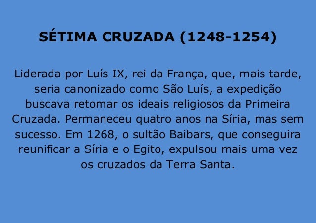 10. 10. SÉTIMA CRUZADA (1248-1254) Liderada por Luís IX, rei da França, que, mais tarde, seria canonizado como São Luís, a expedição buscava retomar os ideais religiosos da Primeira Cruzada. Permaneceu quatro anos na Síria, mas sem sucesso. Em 1268, o sultão Baibars, que conseguira reunificar a Síria e o Egito, expulsou mais uma vez os cruzados da Terra Santa.