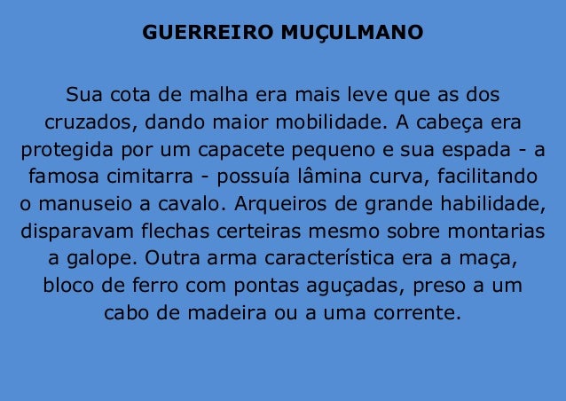 11. 11. GUERREIRO MUÇULMANO Sua cota de malha era mais leve que as dos cruzados, dando maior mobilidade. A cabeça era protegida por um capacete pequeno e sua espada - a famosa cimitarra - possuía lâmina curva, facilitando o manuseio a cavalo. Arqueiros de grande habilidade, disparavam flechas certeiras mesmo sobre montarias a galope. Outra arma característica era a maça, bloco de ferro com pontas aguçadas, preso a um cabo de madeira ou a uma corrente.