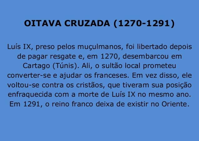 12. 12. OITAVA CRUZADA (1270-1291) Luís IX, preso pelos muçulmanos, foi libertado depois de pagar resgate e, em 1270, desembarcou em Cartago (Túnis). Ali, o sultão local prometeu converter-se e ajudar os franceses. Em vez disso, ele voltou-se contra os cristãos, que tiveram sua posição enfraquecida com a morte de Luís IX no mesmo ano. Em 1291, o reino franco deixa de existir no Oriente.