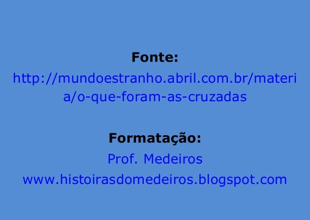13. 13. Fonte: http://mundoestranho.abril.com.br/materi a/o-que-foram-as-cruzadas Formatação: Prof. Medeiros www.histoirasdomedeiros.blogspot.com