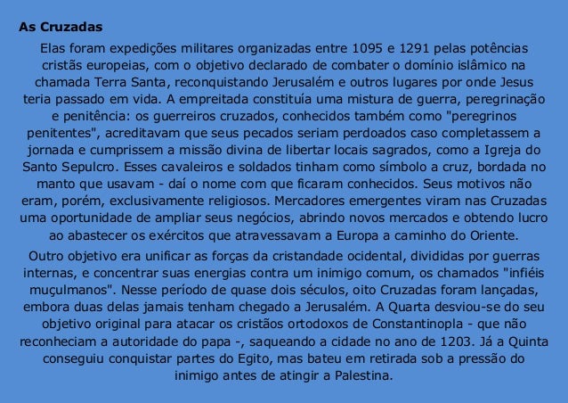 2. 2. As Cruzadas Elas foram expedições militares organizadas entre 1095 e 1291 pelas potências cristãs europeias, com o objetivo declarado de combater o domínio islâmico na chamada Terra Santa, reconquistando Jerusalém e outros lugares por onde Jesus teria passado em vida. A empreitada constituía uma mistura de guerra, peregrinação e penitência: os guerreiros cruzados, conhecidos também como "peregrinos penitentes", acreditavam que seus pecados seriam perdoados caso completassem a jornada e cumprissem a missão divina de libertar locais sagrados, como a Igreja do Santo Sepulcro. Esses cavaleiros e soldados tinham como símbolo a cruz, bordada no manto que usavam - daí o nome com que ficaram conhecidos. Seus motivos não eram, porém, exclusivamente religiosos. Mercadores emergentes viram nas Cruzadas uma oportunidade de ampliar seus negócios, abrindo novos mercados e obtendo lucro ao abastecer os exércitos que atravessavam a Europa a caminho do Oriente. Outro objetivo era unificar as forças da cristandade ocidental, divididas por guerras internas, e concentrar suas energias contra um inimigo comum, os chamados "infiéis muçulmanos". Nesse período de quase dois séculos, oito Cruzadas foram lançadas, embora duas delas jamais tenham chegado a Jerusalém. A Quarta desviou-se do seu objetivo original para atacar os cristãos ortodoxos de Constantinopla - que não reconheciam a autoridade do papa -, saqueando a cidade no ano de 1203. Já a Quinta conseguiu conquistar partes do Egito, mas bateu em retirada sob a pressão do inimigo antes de atingir a Palestina.
