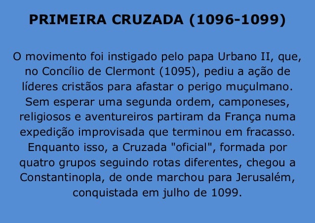 3. 3. PRIMEIRA CRUZADA (1096-1099) O movimento foi instigado pelo papa Urbano II, que, no Concílio de Clermont (1095), pediu a ação de líderes cristãos para afastar o perigo muçulmano. Sem esperar uma segunda ordem, camponeses, religiosos e aventureiros partiram da França numa expedição improvisada que terminou em fracasso. Enquanto isso, a Cruzada "oficial", formada por quatro grupos seguindo rotas diferentes, chegou a Constantinopla, de onde marchou para Jerusalém, conquistada em julho de 1099.