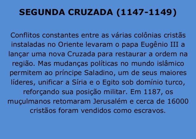 4. 4. SEGUNDA CRUZADA (1147-1149) Conflitos constantes entre as várias colônias cristãs instaladas no Oriente levaram o papa Eugênio III a lançar uma nova Cruzada para restaurar a ordem na região. Mas mudanças políticas no mundo islâmico permitem ao príncipe Saladino, um de seus maiores líderes, unificar a Síria e o Egito sob domínio turco, reforçando sua posição militar. Em 1187, os muçulmanos retomaram Jerusalém e cerca de 16000 cristãos foram vendidos como escravos.