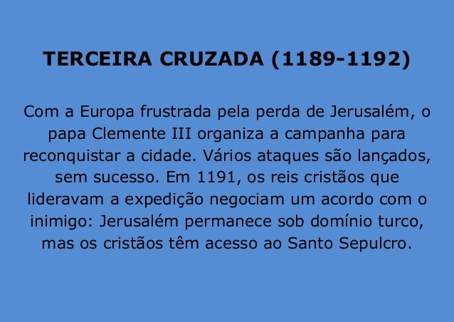 5. 5. TERCEIRA CRUZADA (1189-1192) Com a Europa frustrada pela perda de Jerusalém, o papa Clemente III organiza a campanha para reconquistar a cidade. Vários ataques são lançados, sem sucesso. Em 1191, os reis cristãos que lideravam a expedição negociam um acordo com o inimigo: Jerusalém permanece sob domínio turco, mas os cristãos têm acesso ao Santo Sepulcro.