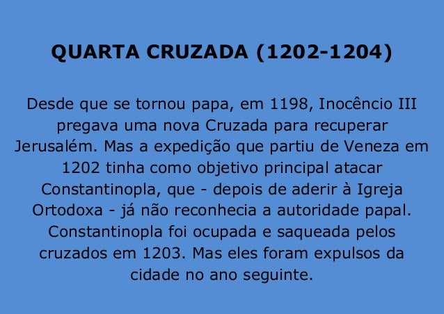 6. 6. QUARTA CRUZADA (1202-1204) Desde que se tornou papa, em 1198, Inocêncio III pregava uma nova Cruzada para recuperar Jerusalém. Mas a expedição que partiu de Veneza em 1202 tinha como objetivo principal atacar Constantinopla, que - depois de aderir à Igreja Ortodoxa - já não reconhecia a autoridade papal. Constantinopla foi ocupada e saqueada pelos cruzados em 1203. Mas eles foram expulsos da cidade no ano seguinte.