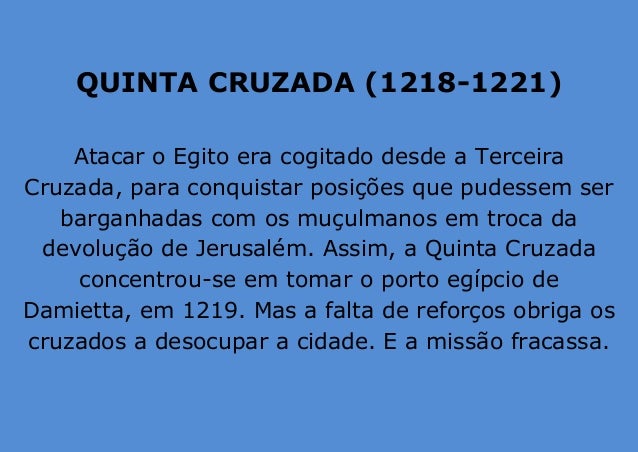 7. 7. QUINTA CRUZADA (1218-1221) Atacar o Egito era cogitado desde a Terceira Cruzada, para conquistar posições que pudessem ser barganhadas com os muçulmanos em troca da devolução de Jerusalém. Assim, a Quinta Cruzada concentrou-se em tomar o porto egípcio de Damietta, em 1219. Mas a falta de reforços obriga os cruzados a desocupar a cidade. E a missão fracassa.