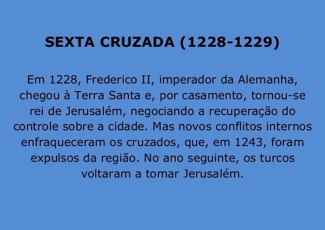 8. 8. SEXTA CRUZADA (1228-1229) Em 1228, Frederico II, imperador da Alemanha, chegou à Terra Santa e, por casamento, tornou-se rei de Jerusalém, negociando a recuperação do controle sobre a cidade. Mas novos conflitos internos enfraqueceram os cruzados, que, em 1243, foram expulsos da região. No ano seguinte, os turcos voltaram a tomar Jerusalém.