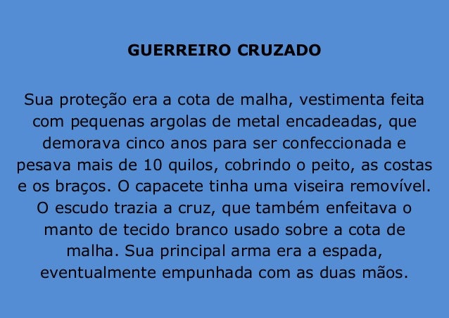 9. 9. GUERREIRO CRUZADO Sua proteção era a cota de malha, vestimenta feita com pequenas argolas de metal encadeadas, que demorava cinco anos para ser confeccionada e pesava mais de 10 quilos, cobrindo o peito, as costas e os braços. O capacete tinha uma viseira removível. O escudo trazia a cruz, que também enfeitava o manto de tecido branco usado sobre a cota de malha. Sua principal arma era a espada, eventualmente empunhada com as duas mãos.