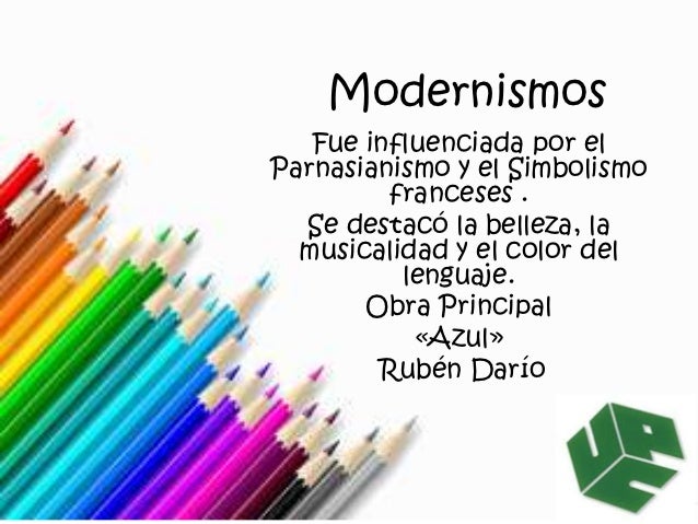 12. 12. Modernismos Fue influenciada por elParnasianismo y el Simbolismo franceses . Se destacó la belleza, la musicalidad y el color del lenguaje. Obra Principal «Azul» Rubén Darío