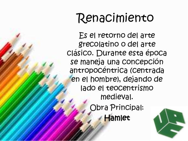 7. 7. Renacimiento Es el retorno del arte grecolatino o del arteclásico. Durante esta época se maneja una concepción antropocéntrica (centrada en el hombre), dejando de lado el teocentrismo medieval. Obra Principal: Hamlet