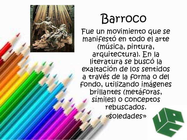 8. 8. BarrocoFue un movimiento que se manifestó en todo el arte (música, pintura, arquitectura). En la literatura se buscó laexaltación de los sentidos a través de la forma o delfondo, utilizando imágenes brillantes (metáforas, símiles) o conceptos rebuscados. «soledades»