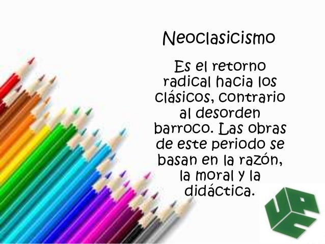 9. 9. Neoclasicismo Es el retorno radical hacia losclásicos, contrario al desordenbarroco. Las obrasde este periodo sebasan en la razón, la moral y la didáctica.