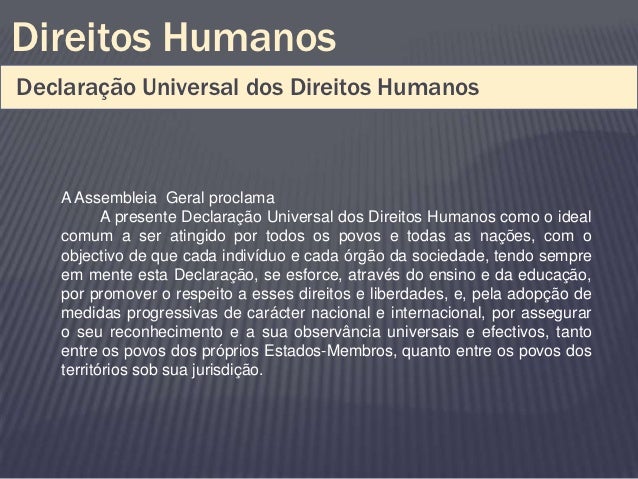 10. 10. Direitos HumanosDeclaração Universal dos Direitos Humanos A Assembleia Geral proclama A presente Declaração Universal dos Direitos Humanos como o ideal comum a ser atingido por todos os povos e todas as nações, com o objectivo de que cada indivíduo e cada órgão da sociedade, tendo sempre em mente esta Declaração, se esforce, através do ensino e da educação, por promover o respeito a esses direitos e liberdades, e, pela adopção de medidas progressivas de carácter nacional e internacional, por assegurar o seu reconhecimento e a sua observância universais e efectivos, tanto entre os povos dos próprios Estados-Membros, quanto entre os povos dos territórios sob sua jurisdição.