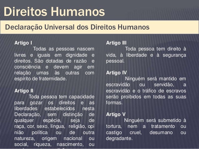 11. 11. Direitos HumanosDeclaração Universal dos Direitos Humanos Artigo I Artigo III Todas as pessoas nascem Toda pessoa tem direito à livres e iguais em dignidade e vida, à liberdade e à segurança direitos. São dotadas de razão e pessoal. consciência e devem agir em relação umas às outras com Artigo IV espírito de fraternidade. Ninguém será mantido em escravidão ou servidão, a Artigo II escravidão e o tráfico de escravos Toda pessoa tem capacidade serão proibidos em todas as suas para gozar os direitos e as formas. liberdades estabelecidos nesta Declaração, sem distinção de Artigo V qualquer espécie, seja de Ninguém será submetido à raça, cor, sexo, língua, religião, opi tortura, nem a tratamento ou nião política ou de outra castigo cruel, desumano ou natureza, origem nacional ou degradante. social, riqueza, nascimento, ou