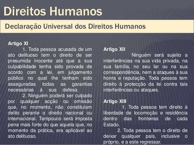 13. 13. Direitos HumanosDeclaração Universal dos Direitos HumanosArtigo XI 1. Toda pessoa acusada de um Artigo XIIato delituoso tem o direito de ser Ninguém será sujeito apresumida inocente até que a sua interferências na sua vida privada, naculpabilidade tenha sido provada de sua família, no seu lar ou na suaacordo com a lei, em julgamento correspondência, nem a ataques à suapúblico no qual lhe tenham sido honra e reputação. Toda pessoa temasseguradas todas as garantias direito à protecção da lei contra taisnecessárias à sua defesa. interferências ou ataques. 2. Ninguém poderá ser culpadopor qualquer acção ou omissão Artigo XIIIque, no momento, não constituíam 1. Toda pessoa tem direito àdelito perante o direito nacional ou liberdade de locomoção e residênciainternacional. Tampouco será imposta dentro das fronteiras de cadapena mais forte do que aquela que, no Estado.momento da prática, era aplicável ao 2. Toda pessoa tem o direito deato delituoso. deixar qualquer país, inclusive o próprio, e a este regressar.