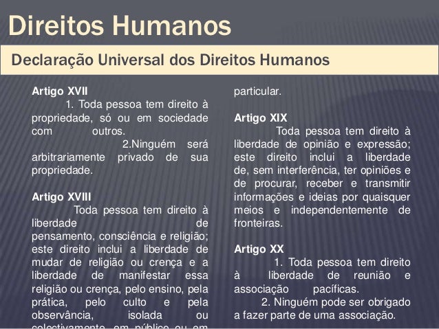 15. 15. Direitos HumanosDeclaração Universal dos Direitos Humanos Artigo XVII particular. 1. Toda pessoa tem direito à propriedade, só ou em sociedade Artigo XIX com outros. Toda pessoa tem direito à 2.Ninguém será liberdade de opinião e expressão; arbitrariamente privado de sua este direito inclui a liberdade propriedade. de, sem interferência, ter opiniões e de procurar, receber e transmitir Artigo XVIII informações e ideias por quaisquer Toda pessoa tem direito à meios e independentemente de liberdade de fronteiras. pensamento, consciência e religião; este direito inclui a liberdade de Artigo XX mudar de religião ou crença e a 1. Toda pessoa tem direito liberdade de manifestar essa à liberdade de reunião e religião ou crença, pelo ensino, pela associação pacíficas. prática, pelo culto e pela 2. Ninguém pode ser obrigado observância, isolada ou a fazer parte de uma associação.