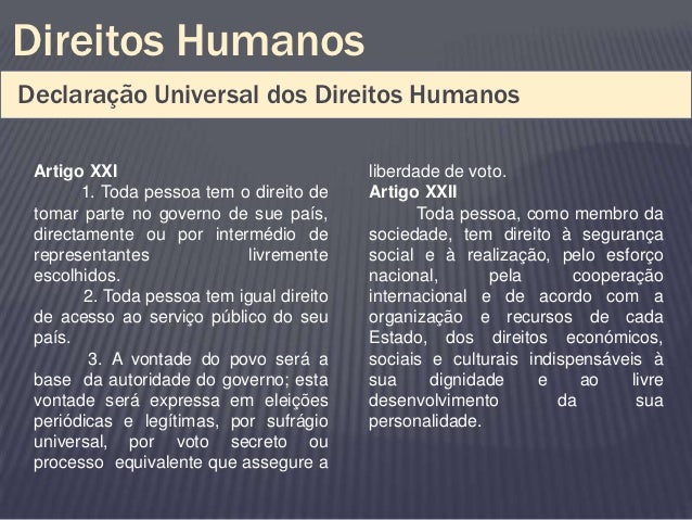 16. 16. Direitos HumanosDeclaração Universal dos Direitos Humanos Artigo XXI liberdade de voto. 1. Toda pessoa tem o direito de Artigo XXII tomar parte no governo de sue país, Toda pessoa, como membro da directamente ou por intermédio de sociedade, tem direito à segurança representantes livremente social e à realização, pelo esforço escolhidos. nacional, pela cooperação 2. Toda pessoa tem igual direito internacional e de acordo com a de acesso ao serviço público do seu organização e recursos de cada país. Estado, dos direitos económicos, 3. A vontade do povo será a sociais e culturais indispensáveis à base da autoridade do governo; esta sua dignidade e ao livre vontade será expressa em eleições desenvolvimento da sua periódicas e legítimas, por sufrágio personalidade. universal, por voto secreto ou processo equivalente que assegure a