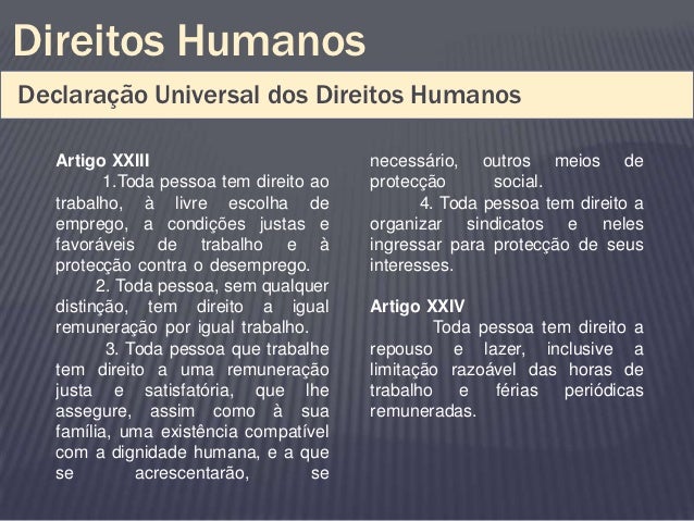 17. 17. Direitos HumanosDeclaração Universal dos Direitos Humanos Artigo XXIII necessário, outros meios de 1.Toda pessoa tem direito ao protecção social. trabalho, à livre escolha de 4. Toda pessoa tem direito a emprego, a condições justas e organizar sindicatos e neles favoráveis de trabalho e à ingressar para protecção de seus protecção contra o desemprego. interesses. 2. Toda pessoa, sem qualquer distinção, tem direito a igual Artigo XXIV remuneração por igual trabalho. Toda pessoa tem direito a 3. Toda pessoa que trabalhe repouso e lazer, inclusive a tem direito a uma remuneração limitação razoável das horas de justa e satisfatória, que lhe trabalho e férias periódicas assegure, assim como à sua remuneradas. família, uma existência compatível com a dignidade humana, e a que se acrescentarão, se
