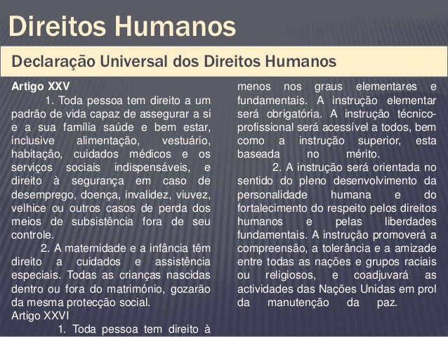 18. 18. Direitos HumanosDeclaração Universal dos Direitos HumanosArtigo XXV menos nos graus elementares e 1. Toda pessoa tem direito a um fundamentais. A instrução elementarpadrão de vida capaz de assegurar a si será obrigatória. A instrução técnico-e a sua família saúde e bem estar, profissional será acessível a todos, beminclusive alimentação, vestuário, como a instrução superior, estahabitação, cuidados médicos e os baseada no mérito.serviços sociais indispensáveis, e 2. A instrução será orientada nodireito à segurança em caso de sentido do pleno desenvolvimento dadesemprego, doença, invalidez, viuvez, personalidade humana e dovelhice ou outros casos de perda dos fortalecimento do respeito pelos direitosmeios de subsistência fora de seu humanos e pelas liberdadescontrole. fundamentais. A instrução promoverá a 2. A maternidade e a infância têm compreensão, a tolerância e a amizadedireito a cuidados e assistência entre todas as nações e grupos raciaisespeciais. Todas as crianças nascidas ou religiosos, e coadjuvará asdentro ou fora do matrimónio, gozarão actividades das Nações Unidas em prolda mesma protecção social. da manutenção da paz.Artigo XXVI 1. Toda pessoa tem direito à