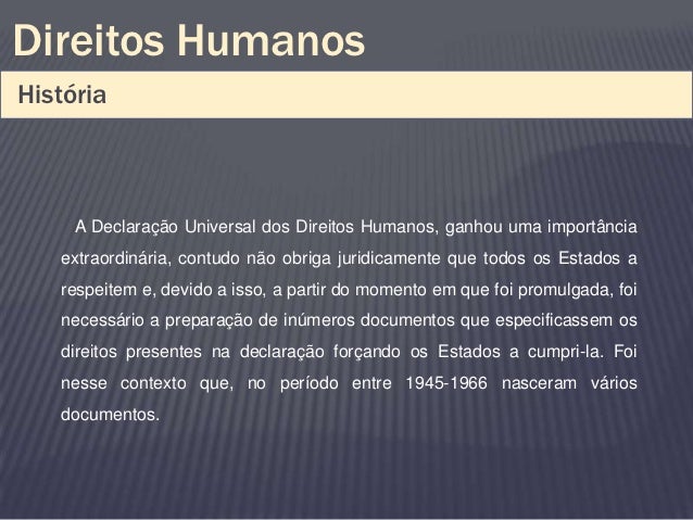 2. 2. Direitos HumanosHistória A Declaração Universal dos Direitos Humanos, ganhou uma importância extraordinária, contudo não obriga juridicamente que todos os Estados a respeitem e, devido a isso, a partir do momento em que foi promulgada, foi necessário a preparação de inúmeros documentos que especificassem os direitos presentes na declaração forçando os Estados a cumpri-la. Foi nesse contexto que, no período entre 1945-1966 nasceram vários documentos.