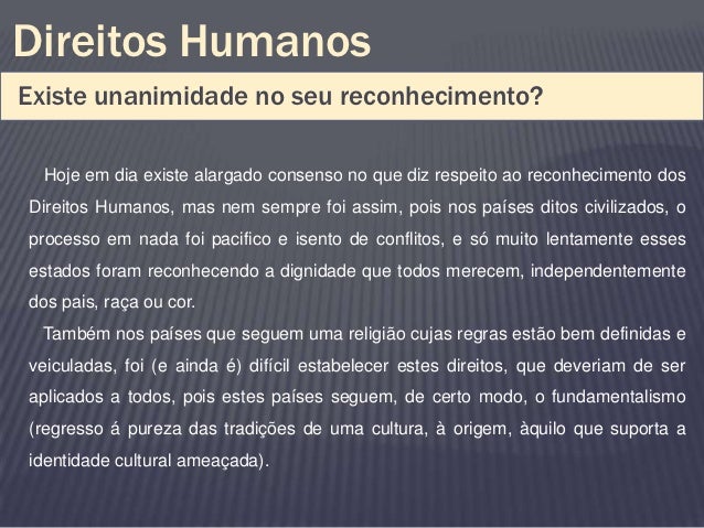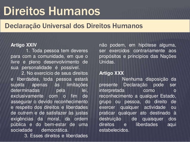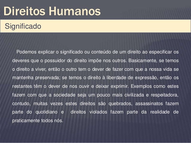 24. 24. Direitos HumanosSignificado Podemos explicar o significado ou conteúdo de um direito ao especificar os deveres que o possuidor do direito impõe nos outros. Basicamente, se temos o direito a viver, então o outro tem o dever de fazer com que a nossa vida se mantenha preservada; se temos o direito à liberdade de expressão, então os restantes têm o dever de nos ouvir e deixar exprimir. Exemplos como estes fazem com que a sociedade seja um pouco mais civilizada e respeitadora, contudo, muitas vezes estes direitos são quebrados, assassinatos fazem parte do quotidiano e direitos violados fazem parte da realidade de praticamente todos nós.