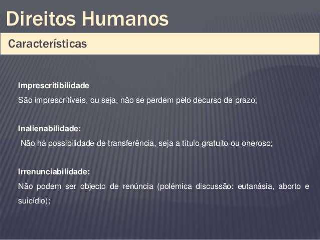 21. 21. Direitos HumanosCaracterísticas Imprescritibilidade São imprescritíveis, ou seja, não se perdem pelo decurso de prazo; Inalienabilidade: Não há possibilidade de transferência, seja a título gratuito ou oneroso; Irrenunciabilidade: Não podem ser objecto de renúncia (polémica discussão: eutanásia, aborto e suicídio);