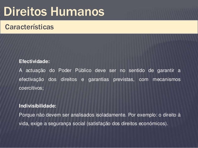 23. 23. Direitos HumanosCaracterísticas Efectividade: A actuação do Poder Público deve ser no sentido de garantir a efectivação dos direitos e garantias previstas, com mecanismos coercitivos; Indivisibilidade: Porque não devem ser analisados isoladamente. Por exemplo: o direito à vida, exige a segurança social (satisfação dos direitos económicos).