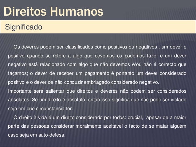 25. 25. Direitos HumanosSignificado Os deveres podem ser classificados como positivos ou negativos , um dever épositivo quando se refere a algo que devemos ou podemos fazer e um devernegativo está relacionado com algo que não devemos e/ou não é correcto quefaçamos; o dever de receber um pagamento é portanto um dever consideradopositivo e o dever de não conduzir embriagado considerado negativo.Importante será salientar que direitos e deveres não podem ser consideradosabsolutos. Se um direito é absoluto, então isso significa que não pode ser violadoseja em que circunstancia for. O direito à vida é um direito considerado por todos: crucial, apesar de a maiorparte das pessoas considerar moralmente aceitável o facto de se matar alguémcaso seja em auto-defesa.