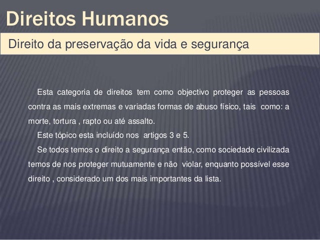 26. 26. Direitos HumanosDireito da preservação da vida e segurança Esta categoria de direitos tem como objectivo proteger as pessoas contra as mais extremas e variadas formas de abuso físico, tais como: a morte, tortura , rapto ou até assalto. Este tópico esta incluído nos artigos 3 e 5. Se todos temos o direito a segurança então, como sociedade civilizada temos de nos proteger mutuamente e não violar, enquanto possível esse direito , considerado um dos mais importantes da lista.